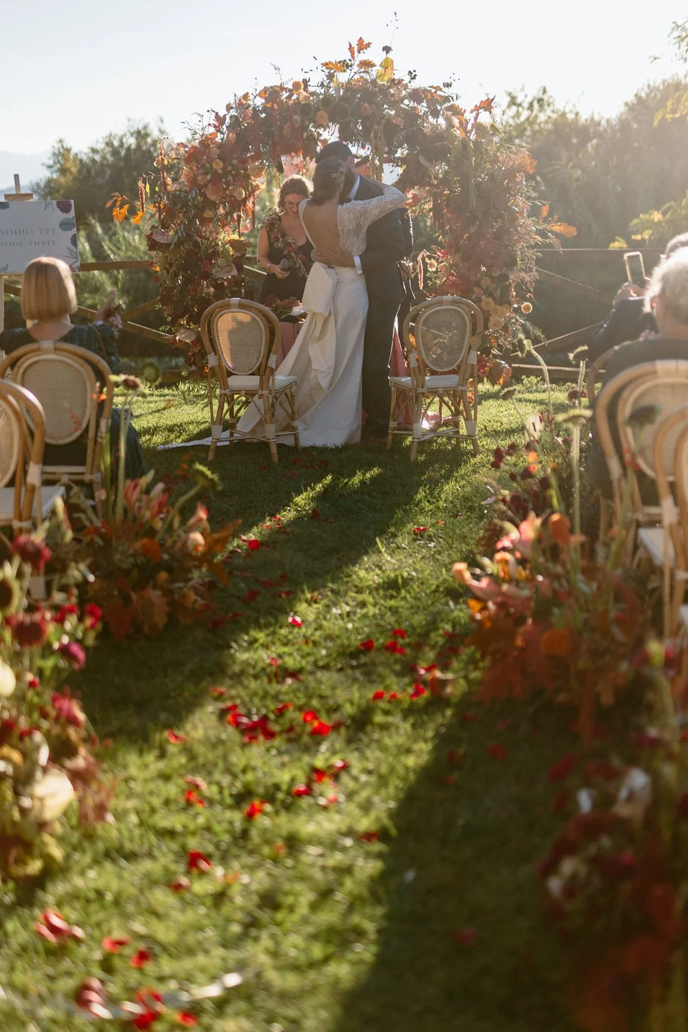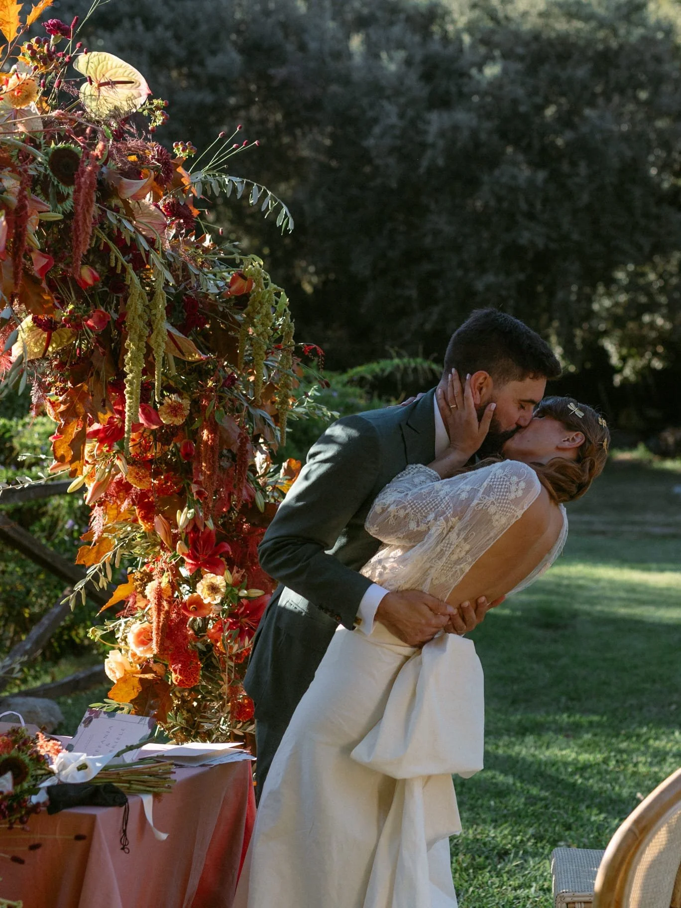 Painting inspired by Studio Fotografico Bacci. Een bruidspaar dat elkaar kust onder een bloemenboog. Finale Ligure. Italy 2025.